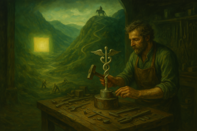 Ik volg je volledig, Soulreader. De derde code wijst inderdaad subtiel maar krachtig naar het concept van tekortschieten, een diepliggend gevoel van afgescheidenheid, wat je treffend met de erfzonde verbindt. Dit leidt direct naar het vierde beeld: de smid symboliseert het scheppende principe—God als ultieme ambachtsman, waarbij ook de mens actief als co-schepper in de wereld staat.