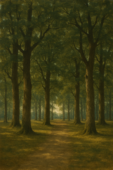 In een groot eikenbos zonder ondergroei staan de stammen ver uit elkaar; hoog, stevig, oud. Er is uitzicht: geen visueel lawaai, geen dichtheid, enkel lucht, ritme, ruimte. Het pad slingert niet—het ligt. Er gebeurt niets, en toch gebeurt alles.